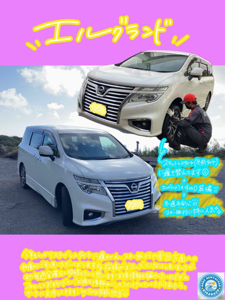 4WD装備のため、まさにこの時期にレンタルするならエルグランド!という感じがしますね♪