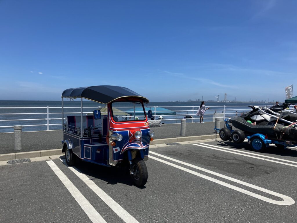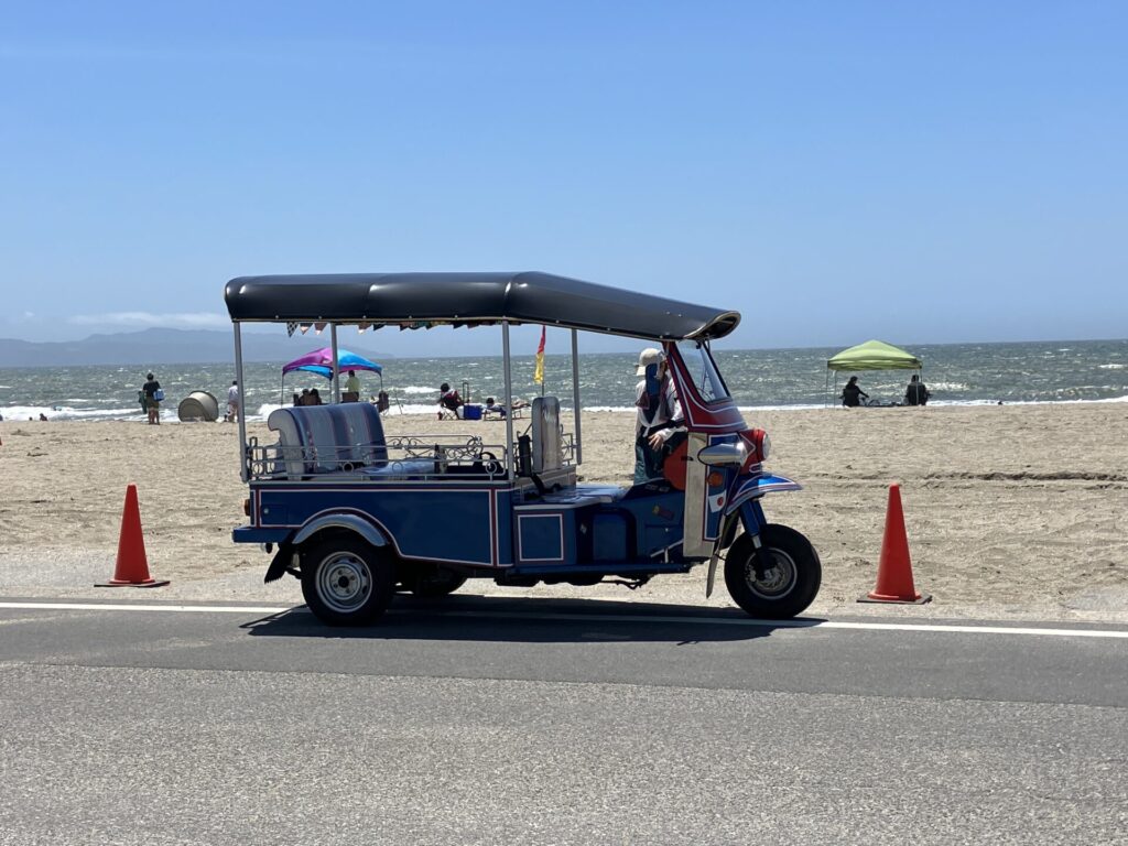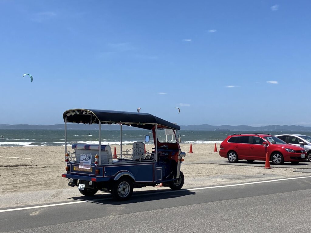 片道約20キロ、気温は35度でしたが、思いのほか快適でした。屋根があるのでバイクよりは全然涼しく、会話も弾みました。